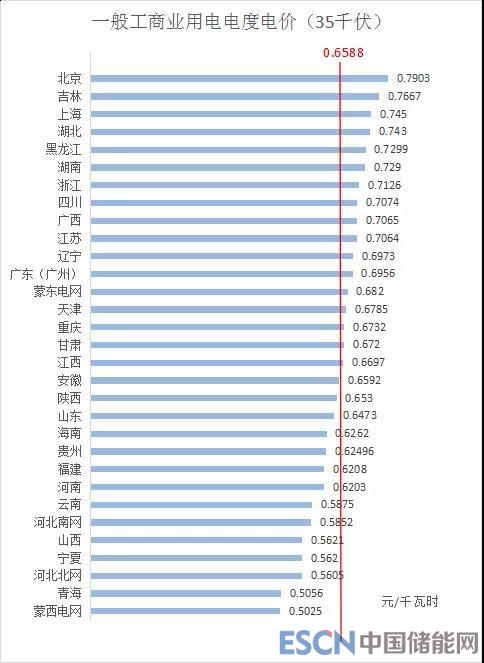 3、35千伏電壓等級(jí)下,全國(guó)平均電價(jià)約為0.6588元/千瓦時(shí),其中,北京最高為0.7903元/千瓦時(shí),蒙西電網(wǎng)最低為0.5025元/千瓦時(shí)。