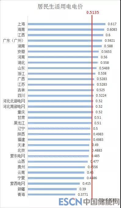 據(jù)公開電價(jià)信息的不完全統(tǒng)計(jì),全國(guó)居民生活用電平均電價(jià)約為0.5135元/千瓦時(shí),其中,上海最高為0.617元/千瓦時(shí),青海最低為0.3771元/千瓦時(shí)。