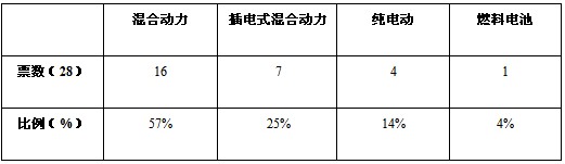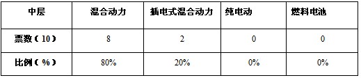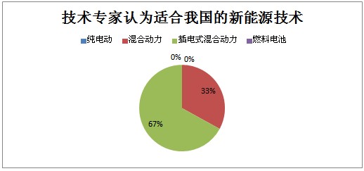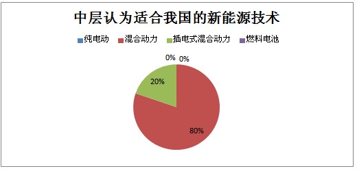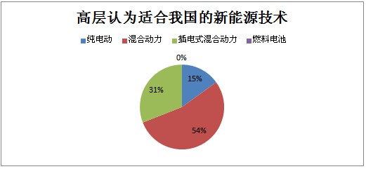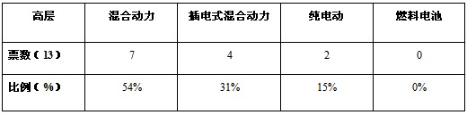 圖表2、3、4、5數(shù)據(jù)顯示,高層和中層認(rèn)為混合動(dòng)力是目前的主推方向,而技術(shù)專家則認(rèn)為在混合動(dòng)力將作為過渡階段,在國家政策的支持下,看好插電式混合動(dòng)力的發(fā)展。