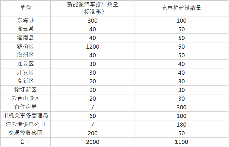 2018年連云港市新能源汽車推廣應(yīng)用和充電設(shè)施建設(shè)任務(wù)分解表