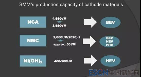 目前,住友的正極材料業(yè)務(wù)重點(diǎn)在NCA材料,該材料目前產(chǎn)能已達(dá)4500噸/月,NMC產(chǎn)能50-60噸/月,2020年,將提升至2000噸/月,鎳氫電池正極材料產(chǎn)能400-500噸/月。