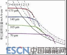 基于目前的電池技術(shù),功率型和能量型電池之間的主要區(qū)別是正極和負極的厚度。較厚的電極活性材料涂層通常會導(dǎo)致更高的能量密度,即以特定的質(zhì)量或體積存儲更高的能量。無論從電池包系統(tǒng)成本還是從駕駛里程的角度看,高能量密度的電池是理想的純電動車電池。因此,在過去十年或更長時間內(nèi)的電池研發(fā)主要集中于提高電池的能量密度,即采用更高容量的材料和較厚的電極。然而,這樣的電池設(shè)計無法適應(yīng)XFC模式:與較薄的涂覆電極相比,在充電過快的情況下,較厚的電極會發(fā)生更迅速的衰減。較薄的電極雖然可以快速充放電,但電池的能量密度會下降。如圖7所示,小于100 μm的電極可以進行高倍率充放電,大于100 μm的電極只能小倍率充放電。當然影響電池倍率的設(shè)計因素有很多,這里只是用電極厚度來舉例說明。