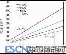 圖2 不同電池組電壓條件下,充電電流與充電功率間的關(guān)系,其中,400 V是當前典型的電動車電池組電壓(紅色線)