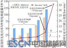 快速充電能力不僅可以用功率作為參數(shù),也可以用每分鐘充電獲得的行程里程數(shù)來定義。假設(shè)電動車的能耗為177 W·h/km,圖1比較了各種電動車以標稱直流快充功率充電時每分鐘可以實現(xiàn)的續(xù)駛里程,并與XFC模式的數(shù)據(jù)進行了比較。由圖可知,大多數(shù)電動汽車的充電能力低于5 km/min,而特斯拉最先進的120 kW超級充電模式達到9 km/min,但即便如此,距離XFC的高于35 km/min的指標還是相距甚遠。