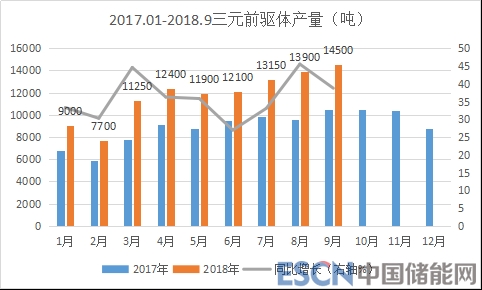 1-9月份三元前驅(qū)體統(tǒng)計(jì)產(chǎn)量10.59萬噸,同比增長(zhǎng)36.3%;