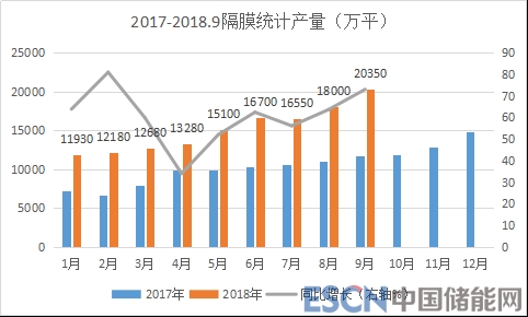 1-9月份隔膜統(tǒng)計(jì)產(chǎn)量13.68億平,同比增長(zhǎng)60.1%,產(chǎn)量增速遠(yuǎn)高于行業(yè)平均增速;