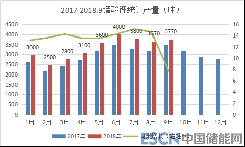 1-9月份錳酸鋰統(tǒng)計(jì)產(chǎn)量3.02萬噸,同比增長(zhǎng)13.1%。值得注意的是,由于錳酸鋰需求情況較好,2018年以來新增不少新廠家,但尚未納入統(tǒng)計(jì)之中,故錳酸鋰實(shí)際產(chǎn)量和增速都會(huì)高于目前的統(tǒng)計(jì)量。
