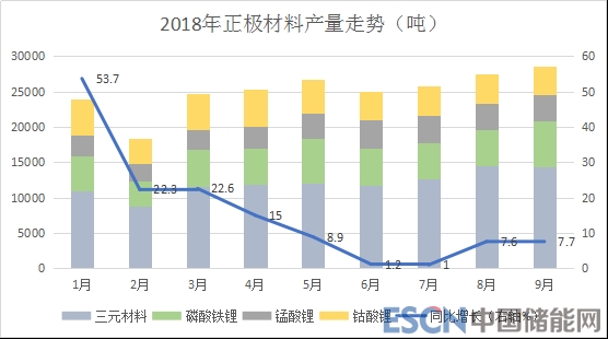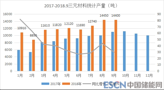 1-9月份三元材料統(tǒng)計(jì)產(chǎn)量10.86萬噸,同比增長(zhǎng)40%,現(xiàn)月產(chǎn)量穩(wěn)定在1.4萬噸以上;