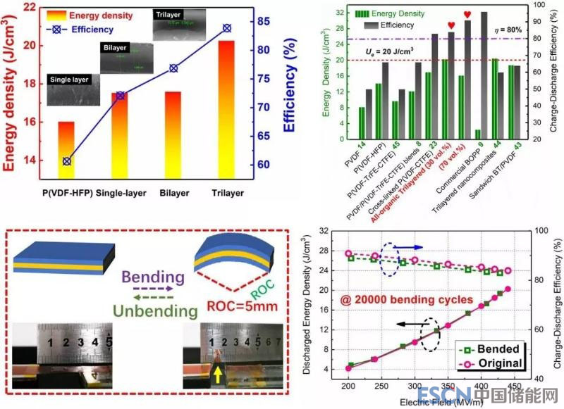 不同構(gòu)型電介質(zhì)薄膜儲(chǔ)能特性與代表性電介質(zhì)薄膜儲(chǔ)能特性比較和機(jī)械彎曲耐疲勞性
