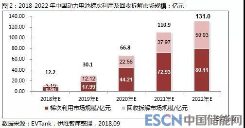 再次,任何項目都需要清晰的盈利模式。針對動力電池回收項目,目前主要是回收拆解和梯次利用兩種處理方式。關于兩種方式經(jīng)濟效益的評價,筆者也在多個項目可行性研究報告中測算過,測算結果表明三元動力電池由于含有鎳鈷錳等稀有金屬,通過拆解提取其中的鋰、鈷、鎳、錳、銅、鋁、石墨、隔膜等材料,理論上能實現(xiàn)每噸大約4.29萬元(該數(shù)據(jù)隨著金屬價格的波動而變化)的經(jīng)濟收益,從而使其具備經(jīng)濟可行性。而磷酸鐵鋰電池如通過報廢拆解僅能夠實現(xiàn)每噸大約0.93萬元的經(jīng)濟收益,難以覆蓋其回收成本,因而磷酸鐵鋰電池更適合用于梯次利用。從市場規(guī)模來看,到2020年中國動力電池回收拆解和梯次利用的總體市場規(guī)模將達到66.8億元,到2022年整體市場規(guī)模將達到131.0億元。