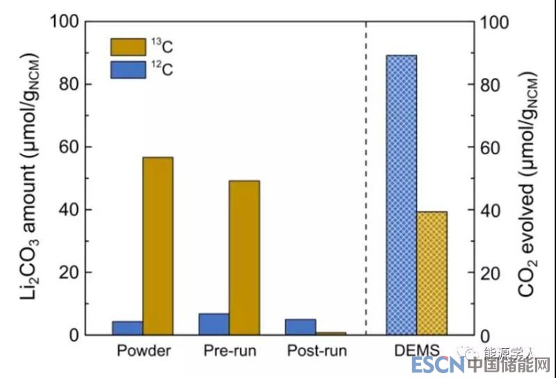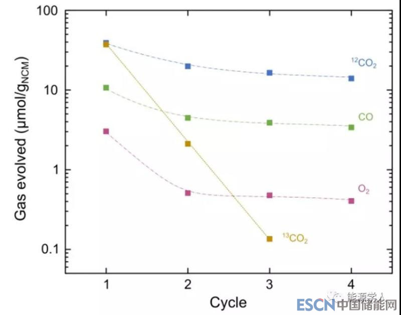 在本次試驗中同位素標記法證明了Li2CO3會產(chǎn)生CO2,但同時也證明了Li2CO3不是CO2的主要來源。在不考慮電解液氧化分解的條件下,NCM材料中逸出的氧原子與電解液反應是電池中CO2的主要來源。