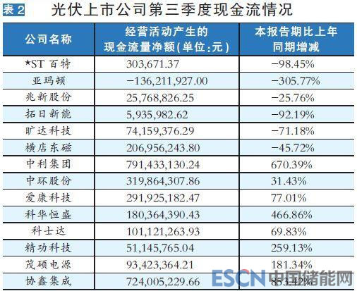 記者注意到,在已公布季報的光伏企業(yè)中,有13家企業(yè)披露了報告期內經(jīng)營活動產生的現(xiàn)金流量凈額,6家企業(yè)較去年同期相比呈負增長,其中拓日新能(股票代碼:002218)、*ST百特(股票代碼:002323)較去年同期分別下降98.45%和92.19%,而亞瑪頓的這一數(shù)值甚至達到了-305.77%(見表2)。