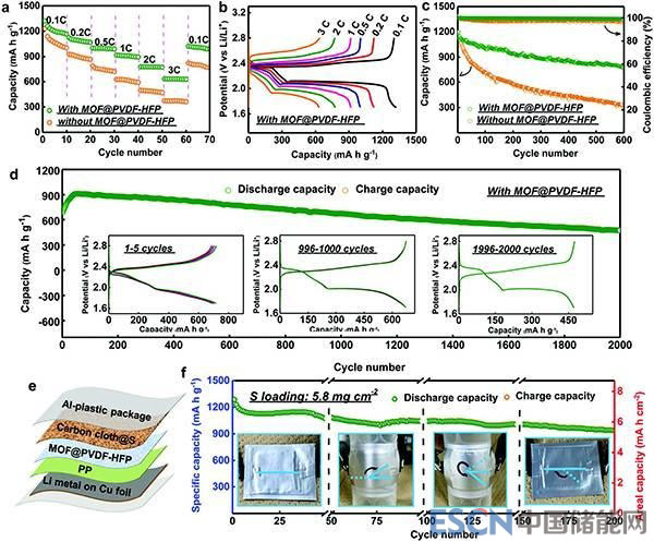 (e)具有MOF @ PVDF-HFP隔膜的柔性Li-S軟包電池的內(nèi)部結(jié)構(gòu)示意圖