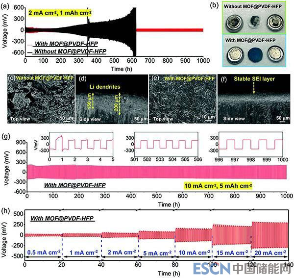 (g)具有MOF @ PVDF-HFP隔膜的Li // Li對(duì)稱電池在10mA cm-2的高電流密度下的循環(huán)穩(wěn)定性,在1000h內(nèi)的面積容量為5mA h cm-2。