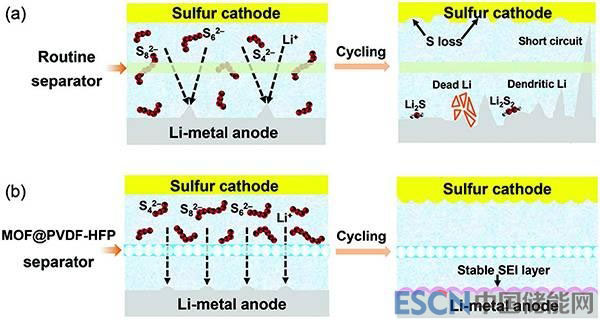 中國儲(chǔ)能網(wǎng)訊:鋰硫電池因其超高的超高的理論能量密度(≈2600Wh kg -1)被廣泛地認(rèn)為是未來大規(guī)模儲(chǔ)能領(lǐng)域應(yīng)用發(fā)展的方向。然而,Li枝晶的生長和多硫化物的穿梭效應(yīng)嚴(yán)重阻礙了它們的實(shí)際應(yīng)用。Li的不均勻電沉積導(dǎo)致Li枝晶生長是鋰二次電池中的典型問題,其將產(chǎn)生一系列的不良影響,包括副反應(yīng)增加,枝晶中死Li的演變,極化增加和體積變化。更糟糕的是,Li枝晶的持續(xù)生長最終會(huì)刺穿隔膜,從而導(dǎo)致內(nèi)部短路和安全隱患。多硫化物穿梭是Li-S電池中的常見現(xiàn)象。具體而言,由硫正極產(chǎn)生的可溶性中間體多硫化物可以通過隔膜到達(dá)鋰負(fù)極并與鋰金屬反應(yīng),在陽極表面形成不溶的Li2S和Li2S2,導(dǎo)致Li金屬陽極表面鈍化和活性硫的損失。已經(jīng)開發(fā)了許多策略致力于解決上述問題。其中隔膜改性一個(gè)很有前景的方案,因?yàn)楦裟な请姵刂胁豢苫蛉钡牟考?。電池隔膜不僅可以作為電子絕緣體,防止兩個(gè)電極直接接觸,還可以控制載體離子的傳輸。因此,開發(fā)具有抑制鋰枝晶和多硫化物穿梭的隔膜對(duì)于實(shí)現(xiàn)高能量密度,長穩(wěn)定循環(huán)的鋰硫電池十分重要的。
