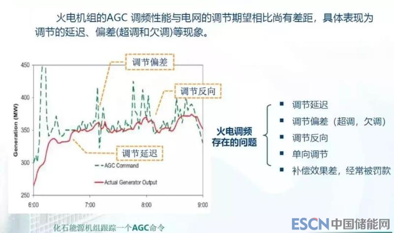 目前,國(guó)內(nèi)火電機(jī)組的AGC調(diào)頻性能與電網(wǎng)的調(diào)節(jié)期望相比尚有差距,表現(xiàn)為調(diào)節(jié)延遲、偏差(超調(diào)和欠調(diào))等現(xiàn)象。下圖為火電調(diào)頻現(xiàn)狀: