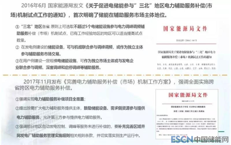 宏觀層面,國(guó)家在2016年和2017年分別出臺(tái)了兩個(gè)文件,分別為《關(guān)于促進(jìn)電儲(chǔ)能參與“三北”地區(qū)電力輔助服務(wù)補(bǔ)償(市場(chǎng))機(jī)制試點(diǎn)工作的通知》和《完善電力輔助服務(wù)補(bǔ)償(市場(chǎng))機(jī)制工作方案》,明確了儲(chǔ)能在輔助服務(wù)市場(chǎng)的主體地位,全面實(shí)施跨省跨區(qū)電力輔助服務(wù)補(bǔ)償。