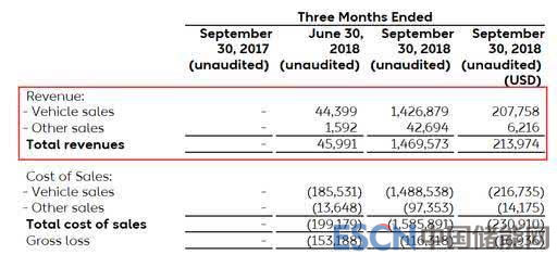 蔚來汽車自 2018 年 6 月才開始有銷售收入,2018上半年的銷售收入約為 4600萬元。3季度收入為14.69億元,同比增長3095%