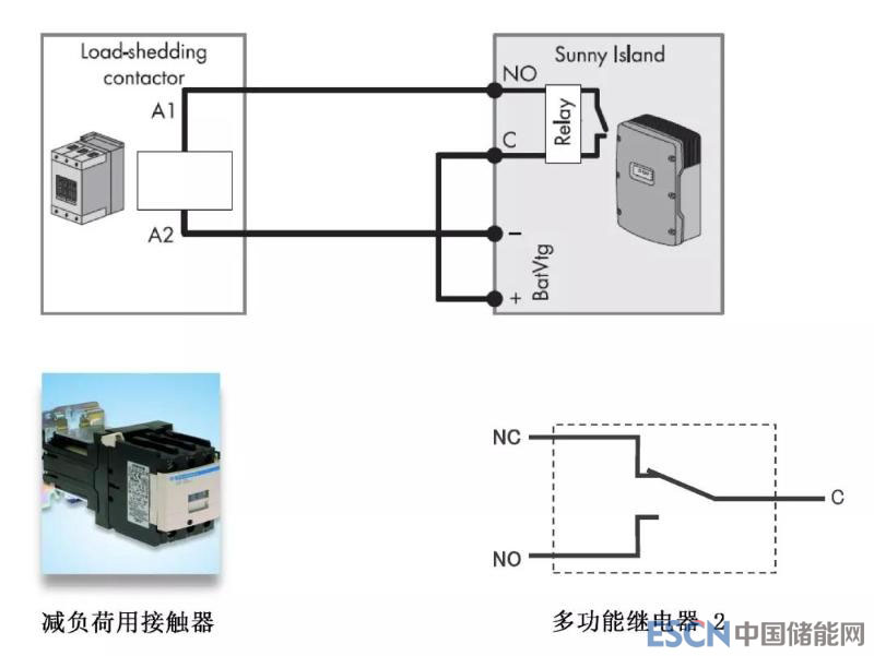 在不具備柴油發(fā)電機(jī)的離網(wǎng)系統(tǒng)中,Sunny Island可通過負(fù)載控制功能來避免當(dāng)光照不足時電池過度放電而影響電池壽命。Sunny Island具備兩個多功能繼電器口,搭配一段式減負(fù)荷用接觸器,在電池SOC過低(比如SOC=30%,可由Sunny Island進(jìn)行設(shè)置)時,啟動多功能繼電器斷開非關(guān)鍵性負(fù)載,以防止電池過度放電。