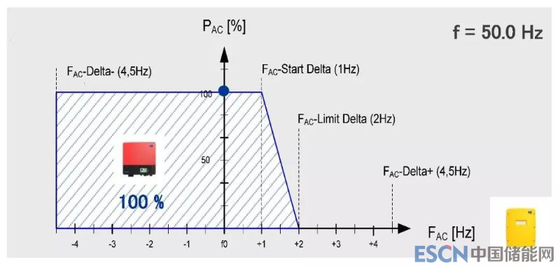 Sunny Island還具備調(diào)頻降載功能,避免電池過充。當(dāng)日照充足,光伏發(fā)電大于負(fù)載消耗且電池已充滿的情況下,Sunny Island會按照下圖曲線調(diào)整電網(wǎng)的頻率以減少PV光伏逆變器的輸出,避免過量充電而損耗電池。