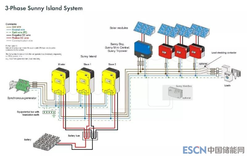 單相系統(tǒng)中,最多可以支持3臺Sunny Island并聯(lián)接入,額定充放電功率最大可以達(dá)到18KW,足以勝任絕大多數(shù)單相系統(tǒng)應(yīng)用。如果負(fù)載為三相負(fù)載,采用3臺Sunny Island可組成三相電網(wǎng)(一臺作為主機(jī)Master,另兩臺為從機(jī)Slave;最高可使用12組共36臺Sunny Island組成三相系統(tǒng))。下圖為典型的三相離網(wǎng)儲能系統(tǒng)電氣連接圖。