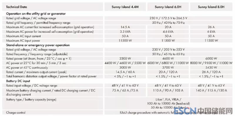 Sunny Island系列有三個型號,Sunny Island 4.4M/6.0H/8.0H。以Sunny Island 8.0H 為例,其額定功率為6KW, 25℃下可以持續(xù)30min輸出8KW功率。其主要技術(shù)參數(shù)如下表:
