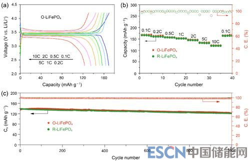 圖4 原始的O-LiFePO4/C和回收的R-LiFePO4/C的電化學(xué)性能曲線。(a)O-LiFePO4/C在0.1–10C不同倍率范圍內(nèi)的典型充放電曲線。(b)倍率性能。(c)O-LiFePO4/C和R-LiFePO4/C在3C倍率下的長循環(huán)穩(wěn)定性。3C對(duì)應(yīng)的充電或放電時(shí)間為20分鐘。