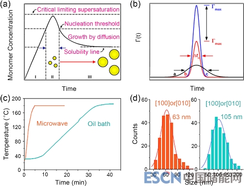 圖1 經(jīng)典的LaMer形核和生長機(jī)制以及實(shí)驗(yàn)結(jié)果。(a)經(jīng)典LaMer機(jī)理,顆粒在溶液中成核和生長過程中單體濃度變化的示意圖。(b)三個(gè)具有高斯分布的形核函數(shù)。形核函數(shù)的寬度()對(duì)應(yīng)形核時(shí)間窗口。(c)微波加熱和油浴加熱兩種加熱模式下的原位溫度與時(shí)間曲線。(d)由兩種不同的加熱模式制備的LiFePO4沿[100]或[010]方向的尺寸統(tǒng)計(jì)。微波加熱的尺寸為63nm,而在常規(guī)油浴加熱的情況下,尺寸為105nm。