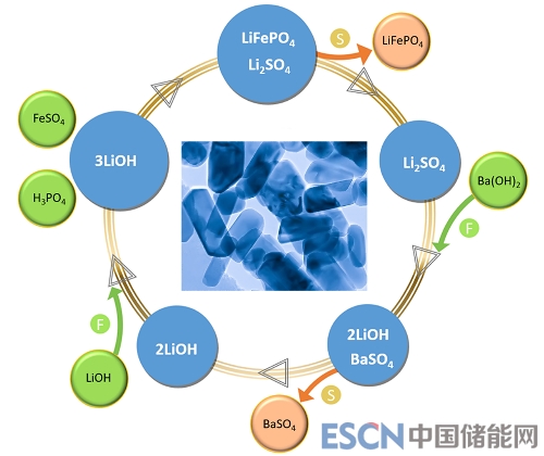 圖2 LiFePO4納米晶水熱合成路線及鋰回收示意圖。以LiOH、FeSO4和H3PO4為原料制備納米LiFePO4。用Ba(OH)2做沉淀劑與濾液反應(yīng),隨后進(jìn)行固液分離,回收LiOH。插圖為LiFePO4的TEM照片。