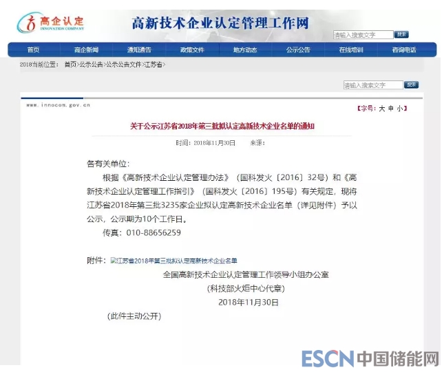 中國儲能網(wǎng)訊:11月30日,全國高新技術(shù)企業(yè)認定管理工作領(lǐng)導小組辦公室公布了“江蘇省2018年第三批擬認定高新技術(shù)企業(yè)名單”,天臣新能源旗下子公司——天臣新能源研究南京有限公司(以下簡稱:天臣新能源南京研究院)獲得國家級高新技術(shù)企業(yè)認定。