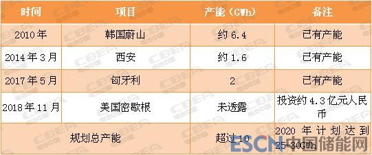 三星SDI動力電池生產(chǎn)基地主要分布在韓國蔚山、中國西安和匈牙利格德。據(jù)不完全統(tǒng)計,2010年,在蔚山建成工廠,先后與寶馬和大眾簽訂協(xié)議,當前主要為寶馬i3和i8提供動力電池;2014年3月,在西安高新區(qū)建設“三星環(huán)新汽車動力電池項目”,每年能為4萬輛以上純電動汽車供應電池(以一輛車需要40WMh計算,產(chǎn)能約為1.6GWh)。有資料顯示,韓國蔚山和西安工廠年產(chǎn)能可滿足20萬輛電動汽車,由此推算,蔚山工廠的產(chǎn)能大約為6.4GWh;2017年5月,在匈牙利格德建設的電池工廠完工,2018年第二季度正式投產(chǎn),年產(chǎn)能可為 5萬輛電動汽車(以一輛車需要40WMh計算,產(chǎn)能約為2GWh)提供電池。據(jù)了解,2020年,三星SDI計劃產(chǎn)能為25-30GWh。