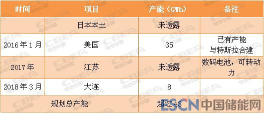 在看到中國新能源汽車火爆的市場后,松下也開始進軍中國市場。據(jù)不完全統(tǒng)計,2017年,松下在江蘇建設工廠,主要生產(chǎn)18650型三元鋰離子電池;2018年3月,松下在此前投資約500億日元(約合29.6億元人民幣)的大連工廠擴建,產(chǎn)能可滿足20萬輛電動汽車(以一輛車需要40WMh計算,20萬輛電動汽車則約需要8GWh)的搭載需求,將主要向北美和中國市場供應方形動力電池。