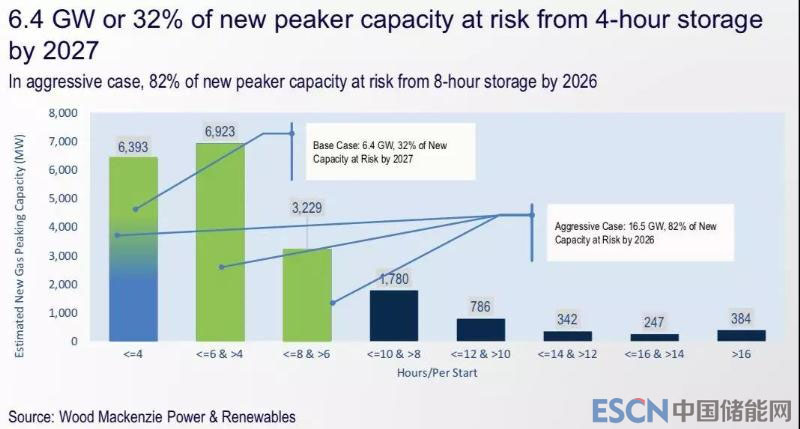 這也是Manghani的第三個(gè)預(yù)測(cè)。Wood Mackenzie Power&Renewables公司預(yù)計(jì),到2026年峰值電廠發(fā)電量高達(dá)6.4GW,約占美國(guó)電力需求量的32%,可能面臨持續(xù)時(shí)間為4小時(shí)或更長(zhǎng)時(shí)間的儲(chǔ)能風(fēng)險(xiǎn),并且這是一個(gè)保守預(yù)測(cè),在此期間,每年的儲(chǔ)能成本將下降6%至8%。