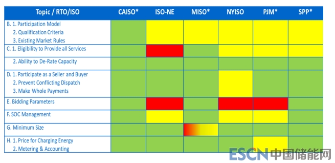 與此同時(shí),開(kāi)發(fā)商和其他利益相關(guān)者有數(shù)百頁(yè)的監(jiān)管文件需要仔細(xì)研究。在對(duì)CES公司為美國(guó)儲(chǔ)能協(xié)會(huì)匯總的合規(guī)性文件的初步評(píng)估中,創(chuàng)建了一個(gè)記分卡,顯示每個(gè)獨(dú)立系統(tǒng)運(yùn)營(yíng)商(ISO)或區(qū)域輸電組織(RTO)是否符合美國(guó)聯(lián)邦能源監(jiān)管委員會(huì)(FERC)訂單的情況。