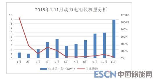 數(shù)據(jù)顯示,2018年1-11月份中國動(dòng)力電池裝機(jī)量達(dá)43.63GWh,同比增長77%。從材料體系來看,三元電池裝機(jī)量為25.21GWh,占比約57%,同比增長約76%。