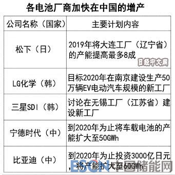此前,全球最大的車載電池制造商寧德時(shí)代新能源科技(CATL)計(jì)劃2020年之前將車載電池的產(chǎn)能提高至2017年的4倍以上,達(dá)到50GWh。比亞迪(BYD)將在2020年之前投入超過(guò)3000億日元,將年產(chǎn)能提高至60GWh。而日本的松下最早將在2019年內(nèi)將車載電池的產(chǎn)能最大提高8成。韓國(guó)的LG化學(xué)也將于2020年在南京新建工廠。