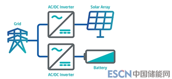 太陽能+儲能共址部署可以是交流耦合,其中儲能系統(tǒng)和太陽能發(fā)電系統(tǒng)位于同一位置,但不共用逆變器。也可以采用直流耦合系統(tǒng),其中太陽能發(fā)電系統(tǒng)和儲能系統(tǒng)耦合在共用雙向逆變器的直流側(cè),其項目成本可以分擔和平衡。根據(jù)NREL公司的一項研究,到2020年,對于共址部署交流耦合和共址部署直流耦合太陽能+儲能來說,系統(tǒng)平衡成本分別降低30%和40%。