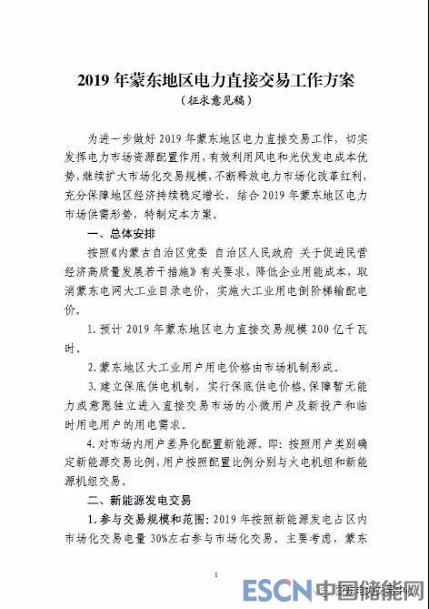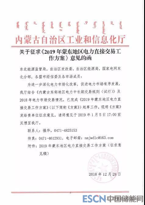 中國(guó)儲(chǔ)能網(wǎng)訊:為進(jìn)一步做好2019年蒙東地區(qū)電力直接交易工作,切實(shí)發(fā)揮電力市場(chǎng)資源配置工作,有效利用風(fēng)電和光伏發(fā)電成本優(yōu)勢(shì),繼續(xù)擴(kuò)大市場(chǎng)化交易規(guī)模,不斷釋放電力市場(chǎng)化改革紅利,充分保障地區(qū)經(jīng)濟(jì)持續(xù)穩(wěn)定增長(zhǎng),近日,蒙東電力交易中心發(fā)布了關(guān)于轉(zhuǎn)發(fā)《內(nèi)蒙古自治區(qū)工信廳關(guān)于征求<2019年蒙東地區(qū)電力直接交易工作方案>意見(jiàn)的函》(以下簡(jiǎn)稱(chēng)《意見(jiàn)》)。