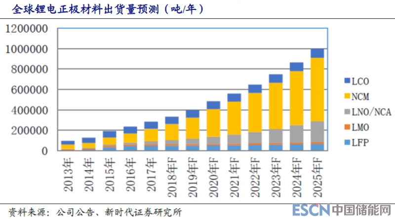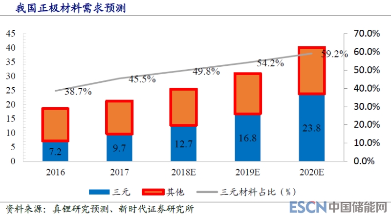 中國儲能網(wǎng)訊:2018~2020年我國正極材料需求量分別有望達(dá)到25.5、31和40.2萬噸,其中2018~2020年三元正極需求量分別為12.7、16.8和23.8萬噸。