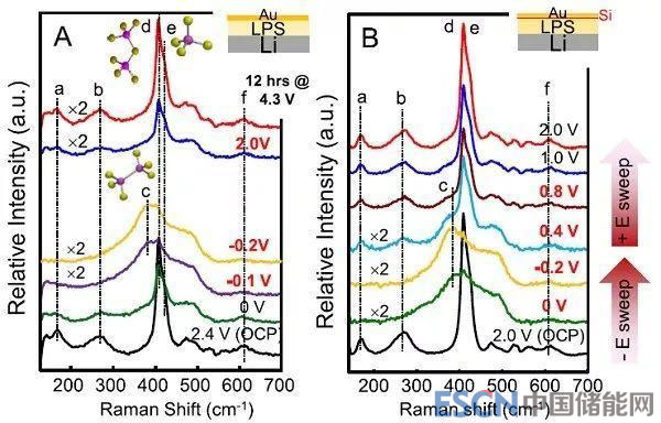 圖5. 在(A)Li/LPS/Au電池和(B)Li/LPS/SiAu電池中的Au電極處獲得的原位拉曼光譜