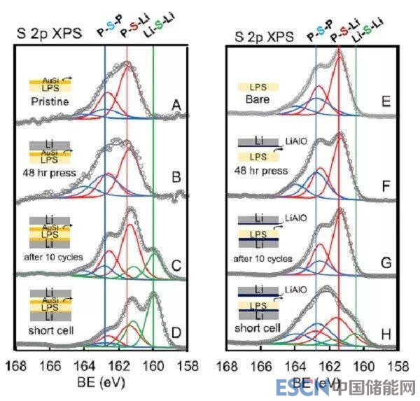 圖4. 在AuSi(A-D)和LiAlO(B-H)夾層存在下,在Li/LPS/Li對(duì)稱電池中組裝/循環(huán)之前和之后在LPS表面獲得的S 2p XPS光譜:(A)原始LPS,(E)裸片LPS,(B,F(xiàn))48小時(shí)后壓制Li,(C,G)10個(gè)CV循環(huán)后,(D,H)在電池短路后