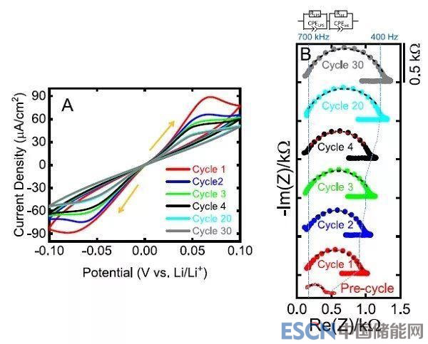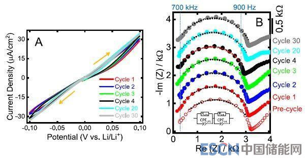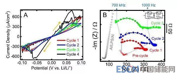 圖2.(A)在0.2mV/s下獲得的Li/AuSi/LPS/SiAu/Li電池的循環(huán)伏安法(CV)和(B)在相同電池之前(紅色空心圓)和CV循環(huán)之后的奈奎斯特圖