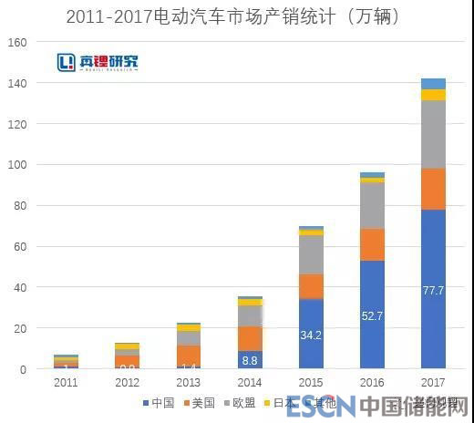 移動(dòng)通信終端智能化的普及以及鋰離子電池技術(shù)的發(fā)展為汽車(chē)智能化提供了沃土,電動(dòng)汽車(chē)應(yīng)運(yùn)而生。2010年12月,通用和日產(chǎn)先后在美國(guó)市場(chǎng)推出電動(dòng)汽車(chē)產(chǎn)品VOLT和LEAF,開(kāi)啟了智能化的第二階段進(jìn)程。在2011年這個(gè)電動(dòng)汽車(chē)商業(yè)化元年,全球共產(chǎn)銷(xiāo)電動(dòng)汽車(chē)6.8萬(wàn)輛,對(duì)應(yīng)的鋰離子電池需求176.7萬(wàn)kWh。2017年,全球共產(chǎn)銷(xiāo)電動(dòng)汽車(chē)140萬(wàn)輛,7年間年均復(fù)合增長(zhǎng)率高達(dá)54%;對(duì)應(yīng)的鋰離子電池需求5370萬(wàn)kWh,年均復(fù)合增長(zhǎng)率高達(dá)63%。汽車(chē)電動(dòng)化時(shí)代已經(jīng)到來(lái)。電動(dòng)汽車(chē)的大發(fā)展也直接帶動(dòng)了鋰離子電池在電動(dòng)自行車(chē)、電動(dòng)三輪車(chē)、低速電動(dòng)汽車(chē)等其他交通工具上的應(yīng)用,2017年整個(gè)交通工具市場(chǎng)的鋰電需求為6667萬(wàn)kWh,已超越消費(fèi)類(lèi)電子產(chǎn)品市場(chǎng)而成為鋰離子電池最大的應(yīng)用市場(chǎng)。