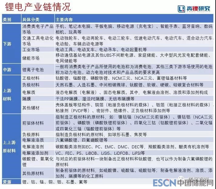 鋰電市場(chǎng)的大發(fā)展直接帶動(dòng)了制造鋰離子電池所需的材料(包括正極材料、負(fù)極材料、電解液、隔膜四大關(guān)鍵材料及其他輔材)、制造相關(guān)材料所需的原材料等產(chǎn)業(yè)的大發(fā)展,也快速提升了這些材料和原材料制造所需的資源的需求。表2是鋰電產(chǎn)業(yè)鏈的情況描述,這些材料端和資源端的具體產(chǎn)業(yè)發(fā)展情況,這里就不贅述。