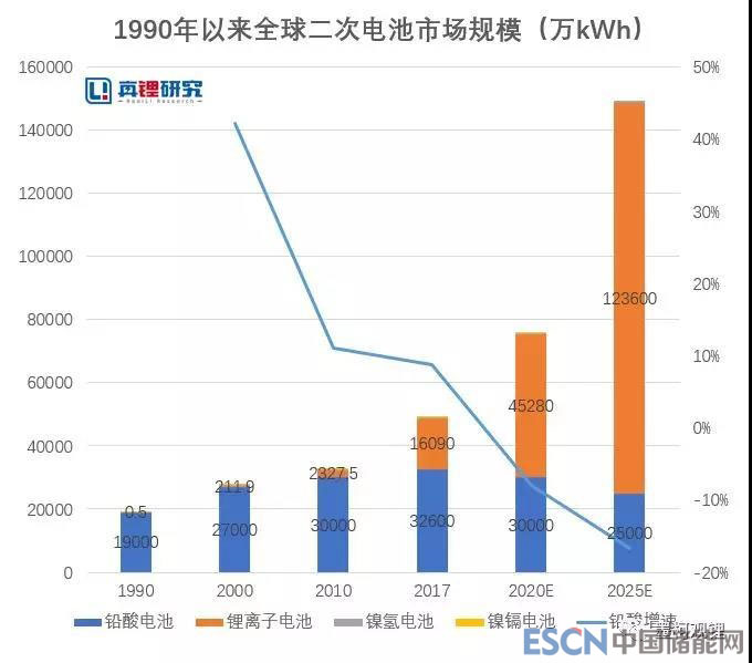 與鉛酸電池、鎳氫電池、鎳鎘電池等其他二次電池(充電電池)相比,鋰離子電池問(wèn)世的時(shí)間最晚,全球第一只鋰離子電池是索尼公司1990年推向市場(chǎng)的。因?yàn)槟芰棵芏雀撸褂孟鄬?duì)安全,沒(méi)有記憶效應(yīng)(性能全面占優(yōu)),而且環(huán)保(不含鉛、鎘、汞等對(duì)環(huán)境有污染的元素),自問(wèn)世以來(lái)鋰離子電池發(fā)展迅猛,市場(chǎng)規(guī)模飛速擴(kuò)大,未來(lái)幾年將確定超越鉛酸電池而成為用量最大的二次電池產(chǎn)品。
