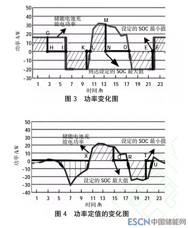在采取峰谷儲能電家的處理工作時,根據(jù)并網(wǎng)平衡的運行可以得到下頁圖3的儲能電池的功率變化圖。