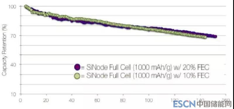 合作方A123已經(jīng)可以實(shí)現(xiàn)實(shí)驗(yàn)室規(guī)模的負(fù)極(1000mAh/g)涂布。與NCA正極制備成全電池,使用含10%和20%FEC電解液的兩種電芯的循環(huán)性能相當(dāng)。
