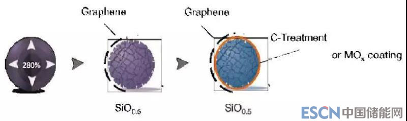 SiNode的技術(shù)是獨(dú)有的硅合金-石墨烯結(jié)構(gòu)。17年SiNode開(kāi)發(fā)了一種新型碳包覆方法,用于在石墨烯包裹之前穩(wěn)定SiOx活性顆粒的表面和SEI膜。通過(guò)碳包覆,SiOx(i.e.,>1500 mAh/g)的首效超過(guò)79%,非常接近目標(biāo)值80%?,F(xiàn)在可以月生產(chǎn)2kg。