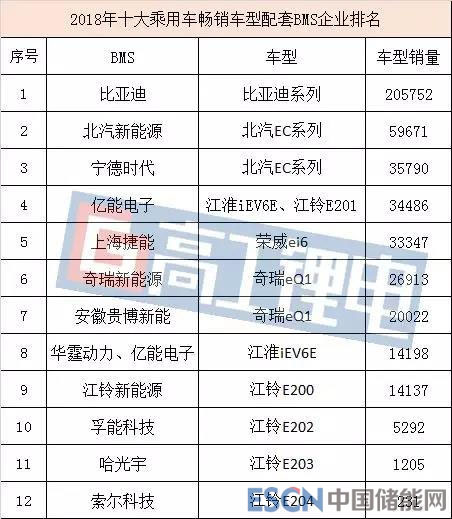 高工鋰電(微信公眾號(hào):weixin-gg-lb)梳理發(fā)現(xiàn),共計(jì)有12家BMS企業(yè)為十大乘用車暢銷車型配套。具體為:寧德時(shí)代、北汽新能源、比亞迪、安徽貴博新能、奇瑞新能源、億能電子、華霆?jiǎng)恿?、上海捷能、江鈴新能源、孚能科技、哈光宇、索爾科技?
