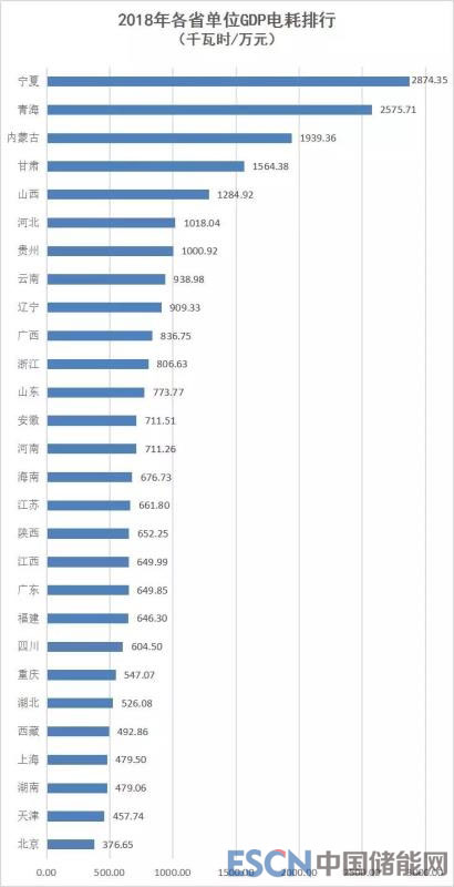 由上圖可見:寧夏單位GDP電耗最高,達(dá)2874.35千瓦時(shí)/萬(wàn)元;青海次之,為2575.71千瓦時(shí)/萬(wàn)元;北京最低,為376.65千瓦時(shí)/萬(wàn)元。